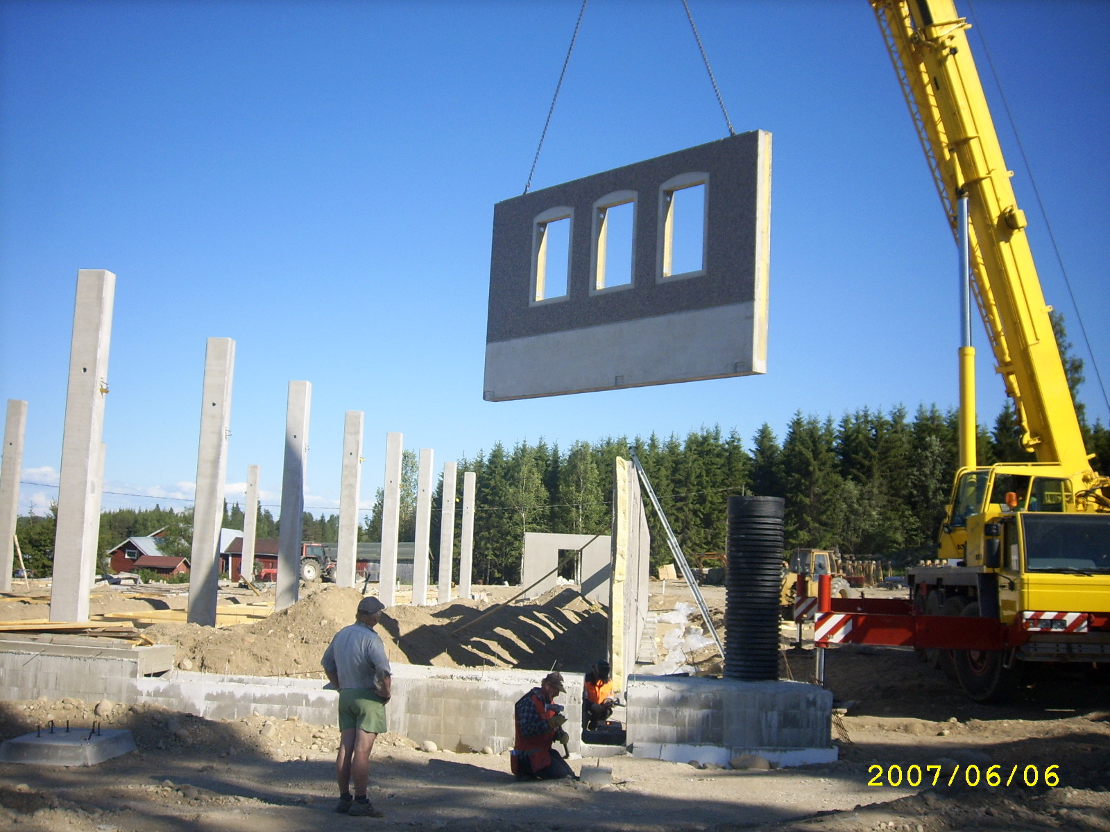 Tänään aloitettiin seinien nosto. Perjantai-iltapäivään mennessä pitäisi olla elementit pystyssä.